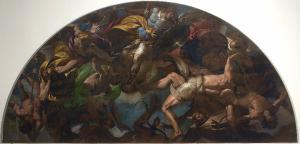 - NOTIZIE STORICO CRITICHE Il dipinto, di forma lunettata, fu eseguito su commissione della famiglia Gallio per la cappella di loro patronato nella distrutta chiesa domenicana di S. Giovanni in Pedemonte di Como, dove faceva pendant con la tela di Carlo Francesco Nuvolone raffigurante S. Michele Arcangelo, pure appartenente alle collezioni dei Musei Civici di Como. \n La cappella del cardinale Tolomeo Gallio in S. Giovanni Pedemonte (seconda a sinistra) era stata progettata da Giovanni Antonio Piotti detto il Vacallo (Della Torre, 1989, 13).\nPer quanto riguarda il dipinto esaminato, la sua fama si affermò immediatamente tra i contemporanei e la sua tradizionale attribuzione al Morazzone è stata accolta dagli studiosi a partire dal Bartoli (Bartoli, 1776) fino a oggi. La Rizzini (Rizzini, 1989) ha rilevato che il soggetto delle due lunette nella cappella Gallio, chiaramente ispirato a istanze antiereticali, era confacente "sia al luogo in cui le due opere erano conservate, cioè il convento domenicano sede del Tribunale dell'Inquisizione a Como, sia al più generale programma riformatore del Borromeo."