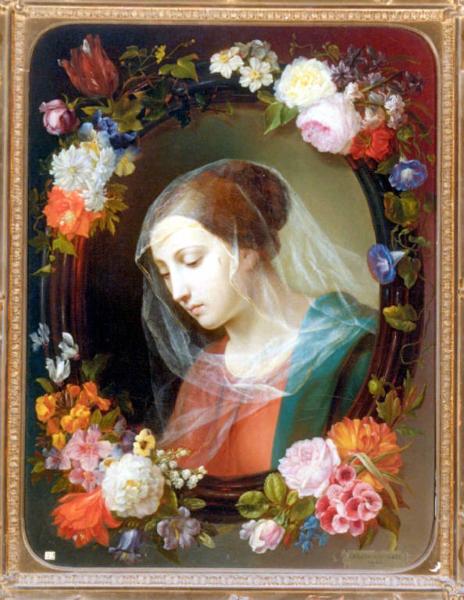 MADONNA ENTRO GHIRLANDA DI FIORI