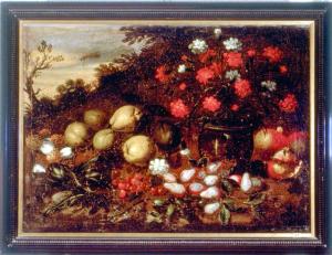 In primo piano è rappresentata una composizione di frutti e verdure con un vaso contenente garofani. A sinistra, sullo sfondo, cespugli e arbusti si stagliano contro il cielo.