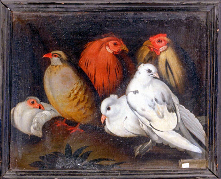 - NOTIZIE STORICO CRITICHE Come osserva l'estensore della scheda cartacea "Il dipinto proviene dal lascito di Carlotta Olginati del 1931[...]. Nell'Elenco dei mobili arredanti il palazzo di Como ...e la villa di Lucino... (Archivio Musei Civici di Como, cart. Legato Olginati) è menzionata al n. 318 una tela conservata in Lucino: Piccioni e galline del 1700, metri 0, 48 x 0, 38, il cui soggetto e le cui misure corrispondono perfettamente alla tela in questione".\nAlessandro Morandotti ha rintracciato il prototipo di questa tela in un dipinto del Cerano conservato in collezione privata (Morandotti, 1999, 241), al quale, tra l'altro, ha associato un altro esemplare conservato nella Fondazione d'Arco di Mantova (Morandotti, 1996, 66) a riprova della fortuna riscossa da questo soggetto in ambito locale.