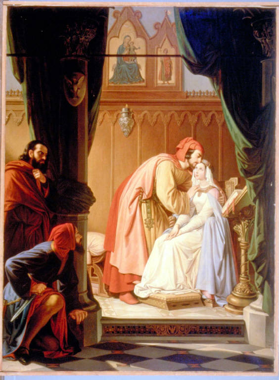 - NOTIZIE STORICO CRITICHE Il dipinto illustra la tragica vicenda vissuta nel XV secolo da due giovani bolognesi di famiglie rivali - Imelda dei Lambertazzi e Bonifacio dei Geremei - conclusa con l'assassinio di Bonifacio da parte dei fratelli di Imelda che, avendo scoperto il corpo morto del fidanzato, morì nel tentativo di farlo rinvenire. Mauro Natale, dopo aver rilevato che dramma servì da intreccio alle tragedie di vari compositori, tra cui G. Donizzetti, ha osservato che "Cesare Mussini propone una laboriosa interpretazione del trucido avvenimento e ne mette in valore il tono domestico e puritano con la descrizione accurata degli arredi, la ridondanza vestimentaria [...] e l'immagine pia appesa alla parete che riproduce, in una fantasiosa cornice neogotica, la tavola centrale del Trittico dei Linaiuoli di Fra Angelico al Museo di San Marco in Firenze" (Natale, 1981, 109). Dal punto di vista compositivo, lo studioso rinviene l'ispirazione della tela in una delle rappresentazioni teatrali del dramma mentre, dal punto di vista stilistico, vi riconosce la nota caratteristica del linguaggio figurativo del Mussini, rappresentata dal 'purismo ingriano' ricorrente nelle sue molteplici composizioni storiche e letterarie.
