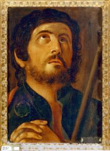 - NOTIZIE STORICO CRITICHE Come osserva l'estensore della scheda cartacea "Il dipinto proviene secondo gli inventari dal legato di Carlotta Olginati, che nel 1931 donò le sue dimore che la famiglia possedeva in Como e a Lucino (Co) al Comune di Como, con l'arredo in esse contenute. Nell'elenco redatto al momento del passaggio di prorprietà e comprendente tutti i beni mobili (in Archivio dei Musei Civici di Como, cart. Legato Olginati) non è tuttavia possibile individuare la tela in questione". \nDal punto di vista iconografico, la presenza della conchiglia sull'abito e del bastone fanno propendere per l'identificazione del personagggio rappresentato in S. Rocco, come già proposto nella scheda cartacea. Tuttavia, si tratta di attributi piuttosto generici e generalmente assegnati ad altri santi pellegrini come, per esempio, S. Giacomo Maggiore.\nDal punto di vista stilistico, se l'espressione di intenso patetismo rimanda alla lezione di Daniele Crespi, la resa realistica del volto non sembra estranea alla lezione di Tanzio da Varallo (Frangi, 2000).