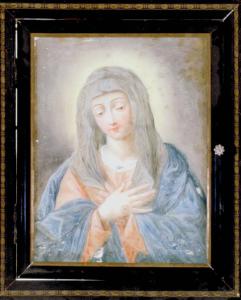 La Madonna ha le mani incrociate sul petto e gli occhi abbassati.