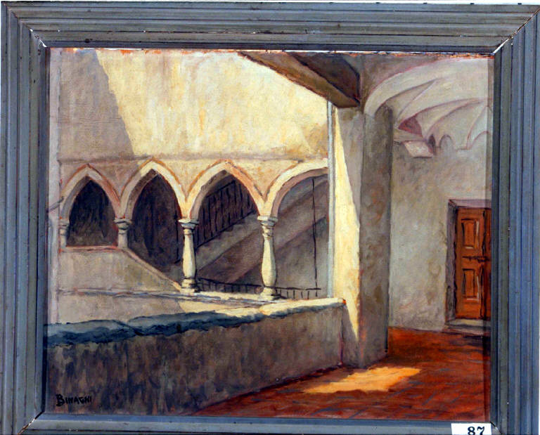 - NOTIZIE STORICO CRITICHE Il dipinto, che riveste un interesse principalmente iconografico e documentario, rappresenta uno scorcio dello scomparso quartiere denominato "Cortesella", all'interno della "città murata", insieme ad altre tre opere di Luigi Binaghi, pure appartenenti allle collezioni dei Musei Civici di Como. In particolare, il portico raffigurato nella scheda in oggetto, sembra lo stesso del dipinto inventariato con il n. 90, qui ripreso dall'esterno.\nIl pittore comasco, che espose per la prima volta alla Permanente di Milano nel 1917 con il quadro Reminescenze e, successivamente, a Torino (Quadriennale del 1928), a Como, a Bologna, a Lecco e a Santiago del Cile, ricevette il Primo premio Lissone nel 1951.