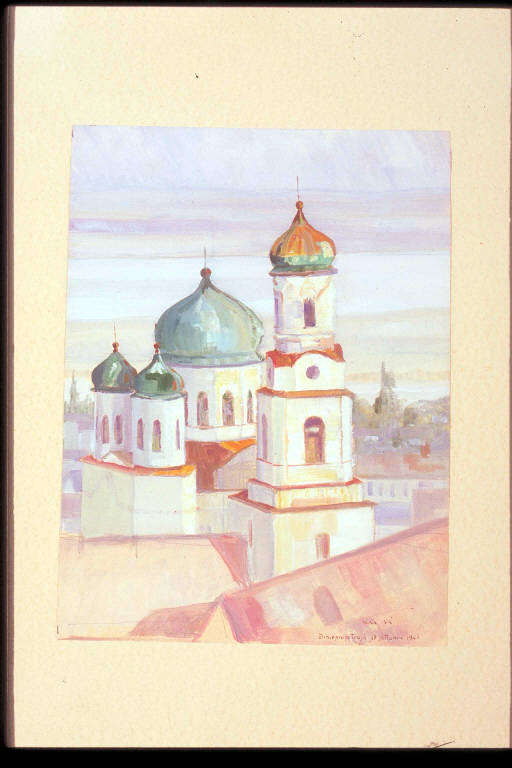 - NOTIZIE STORICO CRITICHE Come osserva l'estensore della scheda cartacea, il dipinto, che riveste un interesse principalmente iconografico e documentario, rappresenta una chiesa russa di Dieniepropetrowsk, presumibilmente visitata personalmente dall'autore che partecipò alla Campagna di Russia del 1941.\nIco Parisi lavorò dal 1935 presso lo studio Terragni di Como e, dal 1943, aprì lo studio "La Ruota" nella stessa città, insieme a sua moglie Luisa Aiani. La sua versatilità lo condusse ad occuparsi di architettura, arredamento, disegno industriale, pittura e fotografia (Caramel, 1987, 173).