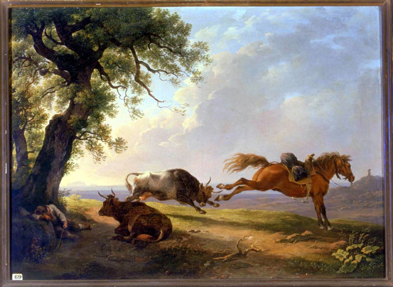 In una campagna pianeggiante, sotto ad un grosso albero, a sinistra, si vede un pastore addormentato. Un cavallo scalcia contro una mucca infuriata. Un'altra mucca è sdraiata.