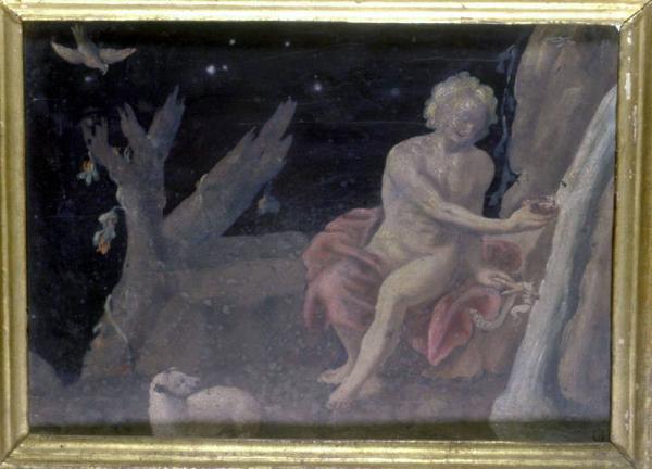 - NOTIZIE STORICO CRITICHE Il dipinto rappresenta in primo piano S. Giovannino con l'agnello e, sullo sfondo, un paese ai piedi di una montagna. \nDatato al XIX secolo dall'estensore della scheda cartacea, si rifa a schemi iconografici di ascendenza luinesca diffusi in ambito lombardo tra Cinque e Seicento. D'altra parte una datazione tra Cinque e Seicento collimerebbe con il periodo di maggiore fortuna dei dipinti su lavagna dove il fondo scuro enfatizzava la brillantezza dei colori e accentuava i connotati religiosi dei soggetti. A questo proposito va sottolineato che nella collezione Olginati, dalla quale proviene il manufatto in esame, era presente un altro dipinto su lavagna ora appartenente alle collezioni dei Musei Civici di Como (n. inv. 279).
