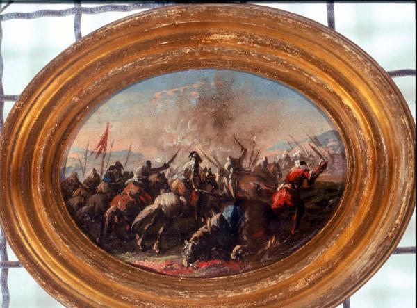 - NOTIZIE STORICO CRITICHE Come osserva l'estensore della scheda cartacea "Nell'elenco dei dipinti provenienti dal legato Galli di Rondineto [...] sono menzionati quattro "quadretti ovali di Battaglie del Bergognone" ai nn. 199-202, che corrispondono alle tele inventariate attualmente con i nn. 384, 385, 386, 387. L'attribuzione al famoso battaglista Jacques Courtois detto il Borgognone (St. Hippolite-Borgogna 1621 - 1676) pare poco plausibile. Le quattro tele di Como presentano alcune analogie con due battaglie, anch'esse di formato ovale (20 x 15), conservate a Firenze presso la Galleria Corsi (cfr. Armi e armati, Catalogo della mostra, Firenze, Museo Bardini, Firenze 1980, schede nn.