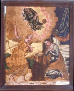 In alto l'Eterno appare tra nuvole per benedire la Vergine, inginocchiata in basso a destra. A sinistra S. Gabriele alza il braccio per indicare l'apparizione.