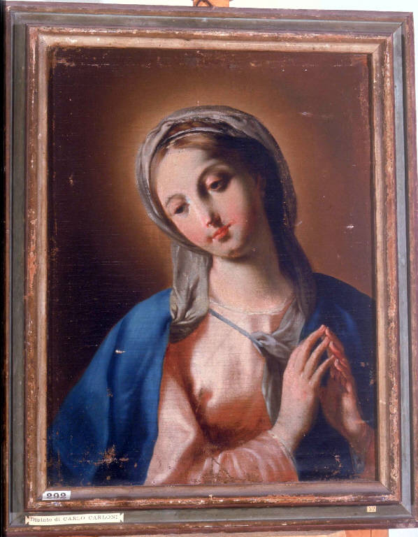 - NOTIZIE STORICO CRITICHE Risulta ignota la provenienza del dipinto, che raffigura un busto con la Madonna in atteggiamento di preghiera\nLa tradizionale attribuzione a Carlo Innocenzo Carloni non trova riscontro nel catalogo delle opere del pittore intelvese, aggiornato da recenti mostre e monografie (Carlo Innocenzo Carloni, 1997; Colombo-Coppa, 1997). D'altra parte, la Madonna di Como è quasi fedelmente derivata dall'immagine della Vergine ritratta nella tela con la Madonna col Bambino e i Santi Leonardo e Francesco da Paola (Museo Diocesano di Brescia) eseguita nel 1737 da Giambattista Pittoni che, in effetti, influenzò lo stile del Carloni in anni inoltrati della sua attività artistica. Sembra, dunque, di poter ricondurre l'opera in esame nell'ambito della produzione di bottega del maestro intelvese, poichè, pur condividendo le caratteristiche di eleganza e raffinatezza della produzione carloniana, non ne uguaglia i singolari esiti di stesura levigata e porcellanata.