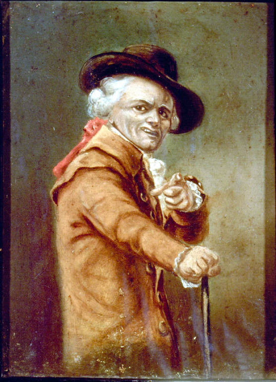 - NOTIZIE STORICO CRITICHE Il dipinto, di provenienza ignota, rientra nella tipica produzione settecentesca di bambocciate che aveva per protagonisti personaggi deformi e riscuoteva successo presso i collezionisti privati alla ricerca di soggetti nuovi. Il fatto che l'uomo raffigurato nel dipinto di Como punti l'indice verso lo spettatore e lo fissi negli occhi, sottintende un significato di carattere moraleggiante.