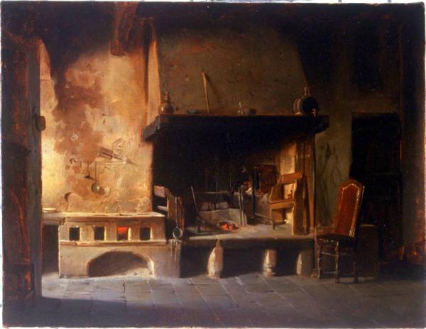 E' raffigurate una cucina rustica con un grande camino al centro e vari oggetti sparpagliati.