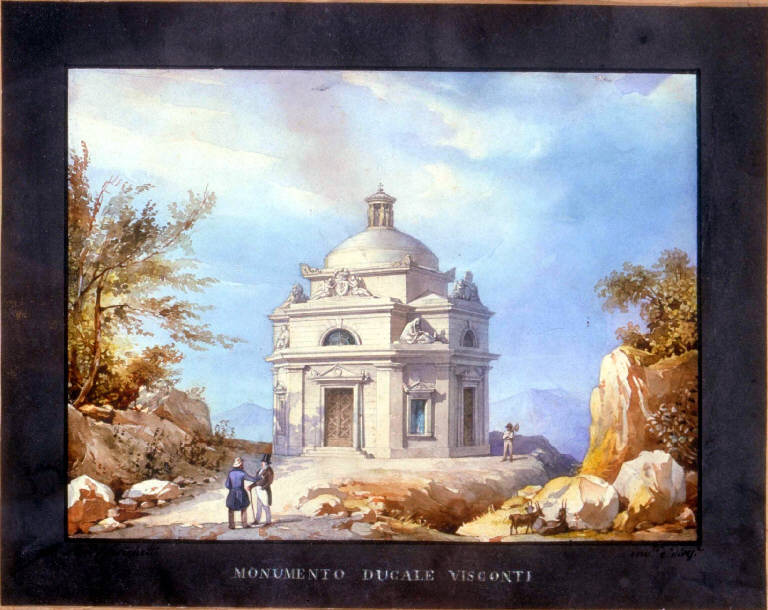 - NOTIZIE STORICO CRITICHE Il dipinto rappresenta una veduta del Monumento ducale Visconti "inventato e disegnato" dall'architetto Celeste Clerichetti (Londra 1835 - S. Croce di Como 1887) che fu assistente di architettura civile all'Università di Pavia e, quindi, al Politecnico di Milano. Studioso dell'architettura romanica lombarda e membro della Commissione conservatrice dei monumenti di Milano, progettò vari palazzi per il capoluogo lombardo, tra i quali palazzo Gavazzi in Montenapoleone e Palazzo Tarsis in Via S. Paolo (Mezzanotte, 1962). Egli, inoltre, realizzò per i Visconti di Modrone il Mausoleo a Cassago Brianza in stile neogotico (Borghi, 2000).