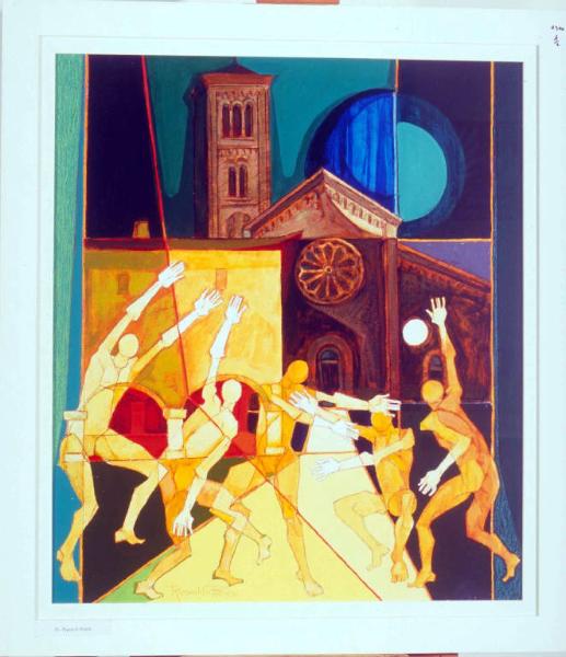 - NOTIZIE STORICO CRITICHE Il dipinto, che fa parte di un nucleo di opere donate dal pittore al Comune di Como, propone una veduta della facciata della chiesa S. Fedele, affiancata dal campanile e nascosta, a sinistra, dai portici con arcate ribassate. Dal portale dell'edificio si diparte la via che avanza, allargandosi, verso il primo piano, dove compaiono figure umane rappresentate come manichini in movimento. La tendenza all'astrazione geometrica che domina in tutta la composizione è sottolineata dall'uso antinaturalistico dei colori.