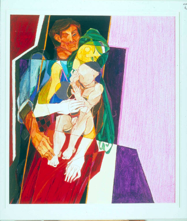 - NOTIZIE STORICO CRITICHE Il dipinto, che fa parte di un nucleo di opere donate dall'autore al Comune di Como, rappresenta una donna nuda seduta su una sedia rossa. Le tre figure del padre, della madre e del figlio piccolo, sono sottoposte a un processo di scomposizione dei volumi di gusto geometrizzante. L'intersezione generata dalla sovrapposizione delle forme viene, inoltre, sottolineata dall'uso antinaturalistico dei colori.
