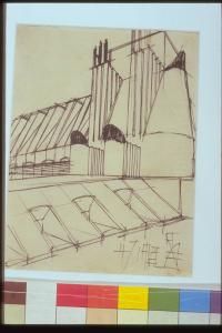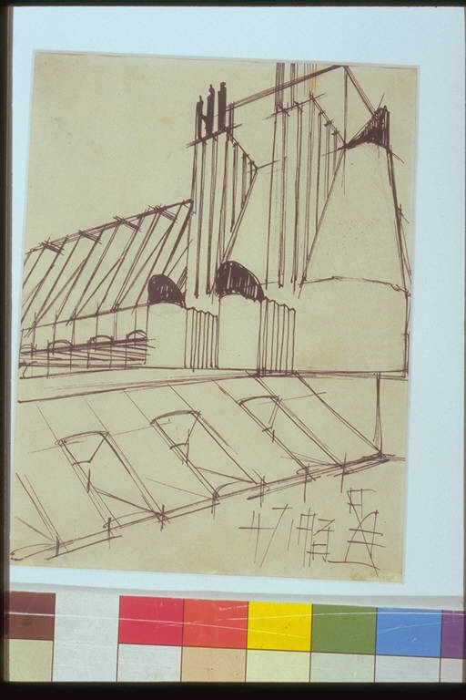 - NOTIZIE STORICO CRITICHE Le centrali elettriche, di cui questo studio è uno dei pochi datati nell'arco del 1913, sono di capitale importanza nella concezione urbanistica santeliana. Le sue centrali, pur non progettate con un corredo tecnico adeguato, come dimostra la raffigurazione approssimativa degli impianti e le loro commistione che sembra riferirsi ad usi differenti, hanno una inequivocabile formulazione grafica che cerca di concretarne la funzione, anche con accentuate suggestioni espressive.