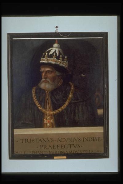- NOTIZIE STORICO CRITICHE Il ritratto venne probabilmente tolto dal Museo di Borgovico per essere portato nella casa Grande dei Giovio, oggi corrispondente ai numeri 107 e 109 di via V.Emanuele.cfr. Rovelli, 1928, p.157. Qui rimase agli eredi con cognome Giovio fino circa alla metà del xix secolo, quando l'ultimo discendente, Paolo Giovio, vendette gli immobili a Pietro Baragiola e divise fra le nipoti e le figlie la collezione dei ritratti.\nIl dipinto venne spedito a Como nel maggio 1549. Unica derivazione è l'incisione dello Stimmer (P.Giovio, 1575, p.230).\nL'esploratore portoghese fece il suo ingrsso trionfale in Roma il 12 marzo 1514, portando a Leone X le spoglie della sua recente conquista dell'India: è a questo che si riferisce l'iscrizione nel quadro. Se questo quadro fosse stato realizzato per Giovio mentre Tristano era a Roma, sarebbe il più antico dipinto della collezione Giovio.\nE' possibile che il dipinto sia stato copiato da un altro di bottega raffaellesca fatto quando Tristano era a Roma, tra il 1514 e il 1520; esso sembra anche essere l'unico ritratto conosciuto di Tristano del xvi secolo. cfr. scheda Klinger nell'Archivio Musei Civici di Como.