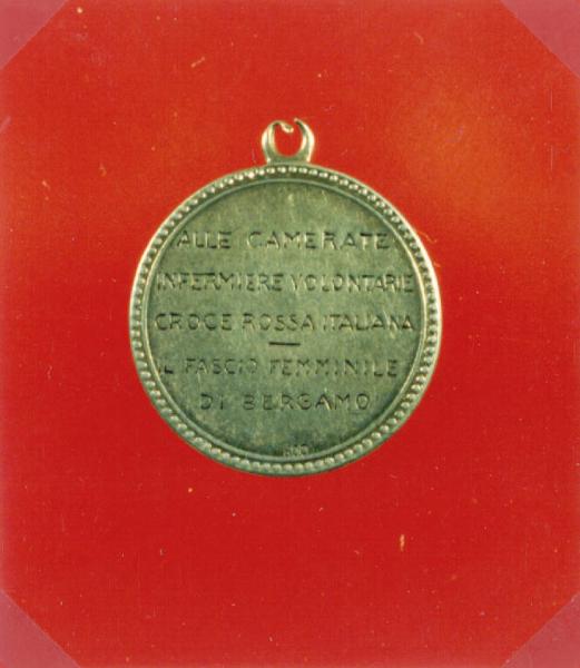 - NOTIZIE STORICO CRITICHE PERIODO STORICO: REGIME FASCISTA\nDATA INSIGNIMENTO: \nDATA MERITO: 1922 - 1943\nEVENTO: ATTIVITA' SANITARIA VOLONTARIA\nNOME INSIGNITO: INFERMIERE VOLONTARIE\nQUALIFICA: INFERMIERE\nLUOGO EVENTO: BERGAMO(?)\nLUOGO E DATA DI CONFERIMENTO: BERGAMO\nNON CI SONO NOTIZIE BILBIOGRAFICHE SUL PEZZO SE NON QUELLE DELL'INVENTARIO INTERNO ALL'ARCHIVIO.