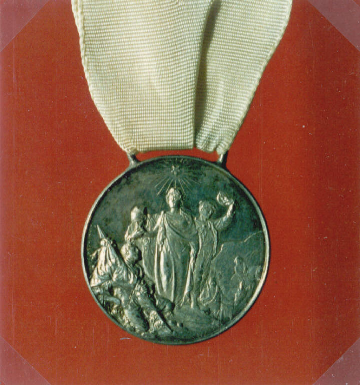 R: ALLEGORIA DELLA CROCE ROSSA SOCCORRITRICE, V: CROCE DI GINEVRA. R: FIGURA MULIEBRE CORONATA D'ALLORO E SOVRASTATA DA UNA STELLA, TRE FIGURE VIRILI LA OMAGGIANO, SULLO SFONDO SCORCIO DI PAESAGGIO TOPICO ABITATO, ISCRIZIONE; V: CROCE, ISCRIZIONE