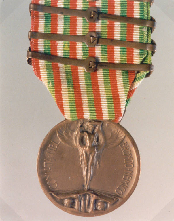 IL NASTRO, CONFORME AL TIPO, ALTERNA SEI TRICOLORI, PER UN TOTALE DI 18 RIGHE. SUL NASTRO DELLA MEDAGLIA SONO GIUSTAPPOSTE QUATTRO FASCETTE DI BRONZO A FASCIO D'ALLORO, IL CUI CARTIGLIO RECA LE DATE 1915, 1916, 1917, 1918