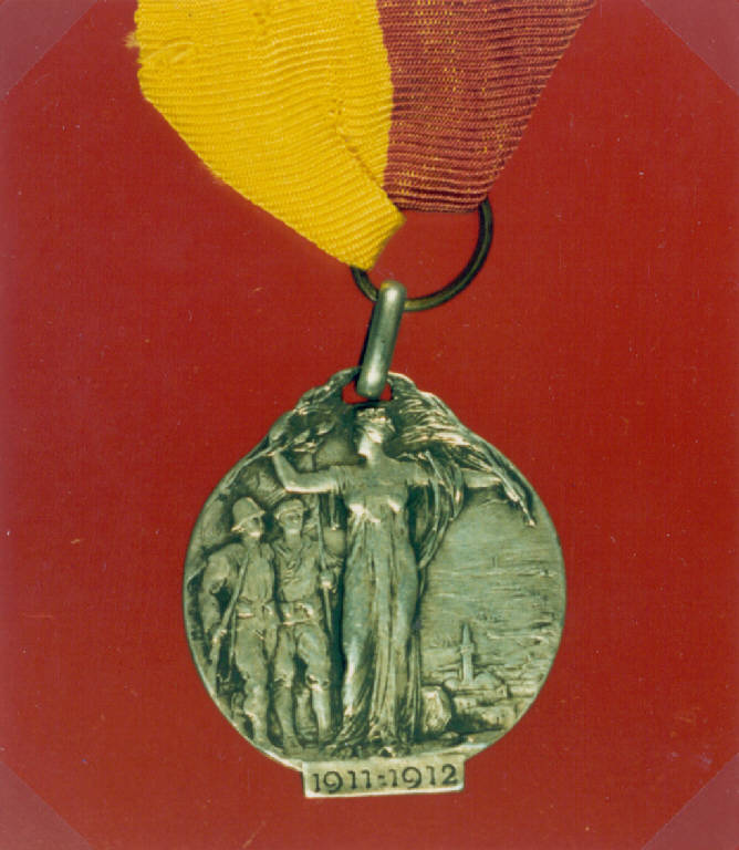 R: ALLEGORIA DELL'ITALIA, TOPICO TURCO; V: STEMMA DELLA MUNICIPALITA' DI BERGAMO. R: FIGURA MULIEBRECON IN MANO UN RAMO D'ALLORO ED UNO DI PALMA, SULLO SFONDO UNA MOSCHEA CON MINARETO, A SINISTRA DUE MILITARI IN DIVISA COLONIALE; ISCRIZIONE; V: STELLA A CINQUE PUNTE, PALMA, STEMMA, ISCRIZIONE