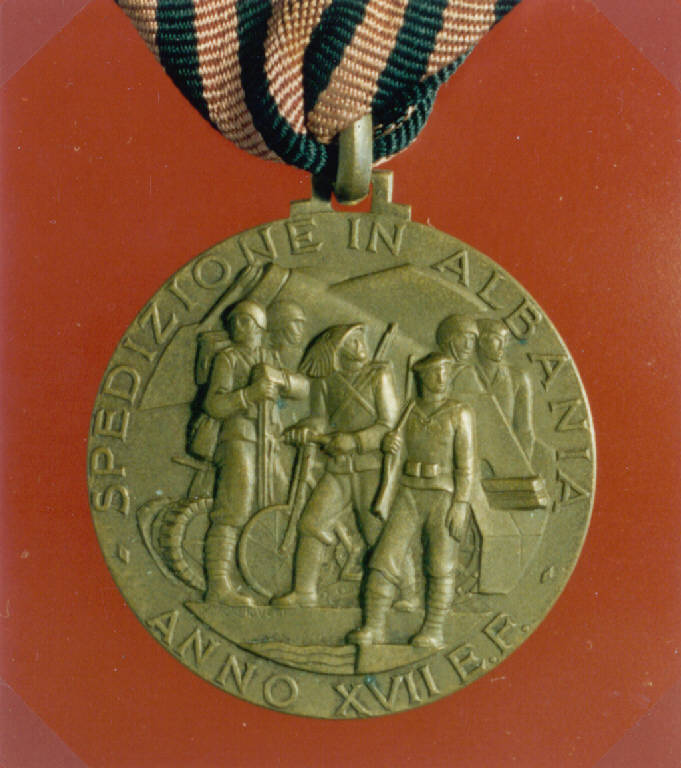 R: ALLEGORIA DEI SEI CORPI DELLE F.A. DELLA SPEDIZIONE ITALIANA IN ALBANIA; V: STEMMA SABAUDO, STEMMA ALBANESE. R: UN FANTE, UN BERSAGLIERE, UN ARTIGLIERE, UN AVIERE, UN MARINAIO DELLA REGIA MARINA ED UNO DELLA MARINA MERCANTILE E LE ARMI DI COMPETENZA, ISCRIZIONE; V: AQUILA CON SCUDO CHE REGGE CON GLI ARTIGLI UN FASCIO, AQUILA BICIPITE, NODI, ISCRIZIONE