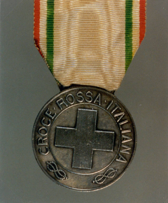 IL NASTRO DELLA MEDAGLIA E' DI COLORE BIANCO UNITO CON DUE BANDE TRICOLORI AI LATI.