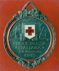 R: ALLEGORIA DELLA CROCE ROSSA; STEMMA CON LA CROCE DI GINEVRA. R: UNA FIGURA MULIEBRE VELATA SOCCORRE UN FERITO, SULLO SFONDO UN CAMPO DI BATTAGLIA; ISCRIZIONE; V: STEMMA CON CROCE GRECA CON NAPPE AI LATI, SULLO SFONDO BAIONETTE, ISCRIZIONE