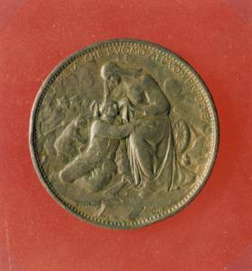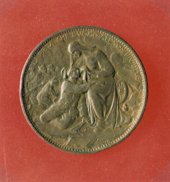 R: ALLEGORIA DELLA CROCE ROSSA; STEMMA CON LA CROCE DI GINEVRA. R: UNA FIGURA MULIEBRE VELATA SOCCORRE UN FERITO, SULLO SFONDO UN CAMPO DI BATTAGLIA; ISCRIZIONE; V: STEMMA CON CROCE GRECA CON NAPPE AI LATI, SULLO SFONDO BAIONETTE, ISCRIZIONE