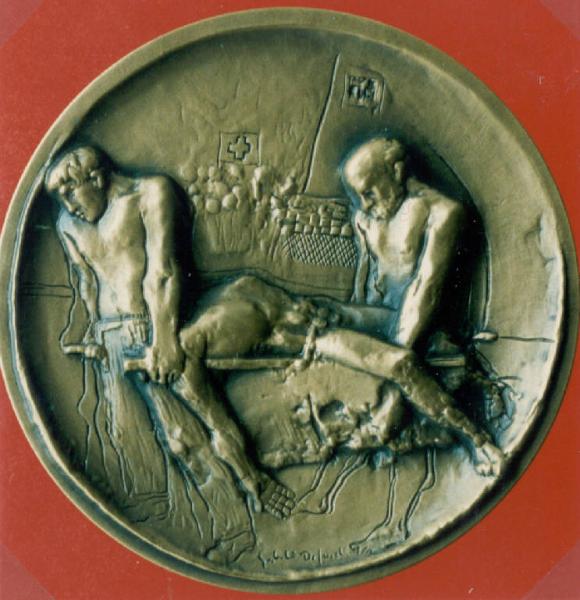 R: ALLEGORIA DEL SOCCORSO; V: CROCE DI GINEVRA, CITTA' DI BERGAMO. R: DUE UOMINI TRASPORTANO SU UNA BARELLA UN TERZO FERITO, SULLO SFONDO LA FOLLA E DUE BANDIERE; ISCRIZIONE V: CROCE GRECA, SAGOMA DI UNA CITTA', ISCRIZIONE