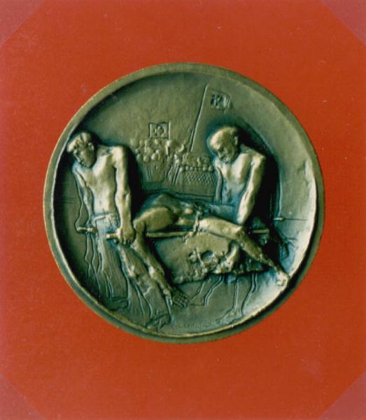 R: ALLEGORIA DEL SOCCORSO; V: CROCE DI GINEVRA, CITTA' DI BERGAMO. R: DUE UOMINI TRASPORTANO SU UNA BARELLA UN TERZO FERITO, SULLO SFONDO LA FOLLA E DUE BANDIERE; ISCRIZIONE V: CROCE GRECA, SAGOMA DI UNA CITTA', ISCRIZIONE