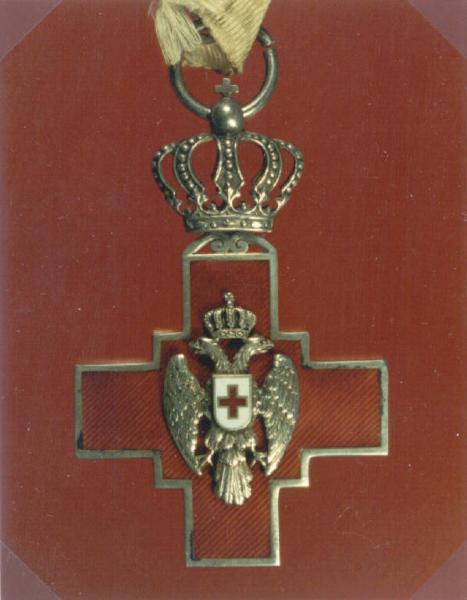 GLI INCROCI DEI BRACCI SONO ANGOLATI COSì DA DIVENIRE I QUATTRO VERTICI DI UN QUADRATO IDEALE INNESTATO ORTOGONALMENTE SULLA CROCE. I PROFILI DEL PEZZO E LA CORONA SOVRASTANTE IL BRACCIO VERTICALE -CONCLUSO DA UNA CIMASA A DUE VOLUTE RISGUARDANTESI-SONO IN ARGENTO; IL RESTO E' COMPLETAMENTE SMALTATO, ANCHE SUL VERSO. L'AQUILA BICIPITE SORMONTATA DALLA CORONA E RECANTE SUL PETTO UNO SCUDETTO E' APPLICATA