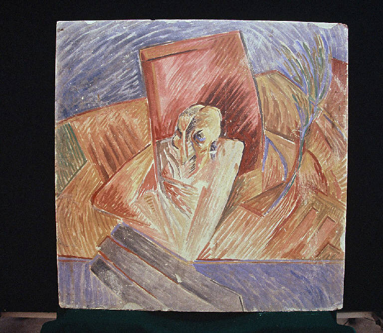- NOTIZIE STORICO CRITICHE Al centro dell'affresco una sagoma umana astratta, delineata da pennellate color ocra rossa, è circondata, in un movimento circolare, da figure geometriche poliedriche sulle gamme degli ocra, in cui si evidenziano le pennellate. Lo sfondo è formato da pennellate concentriche di colore viola.