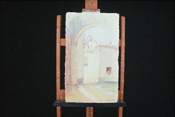 Affresco eseguito su formella di truciolato ricoperta di intonaco senza intelaiatura in legno.