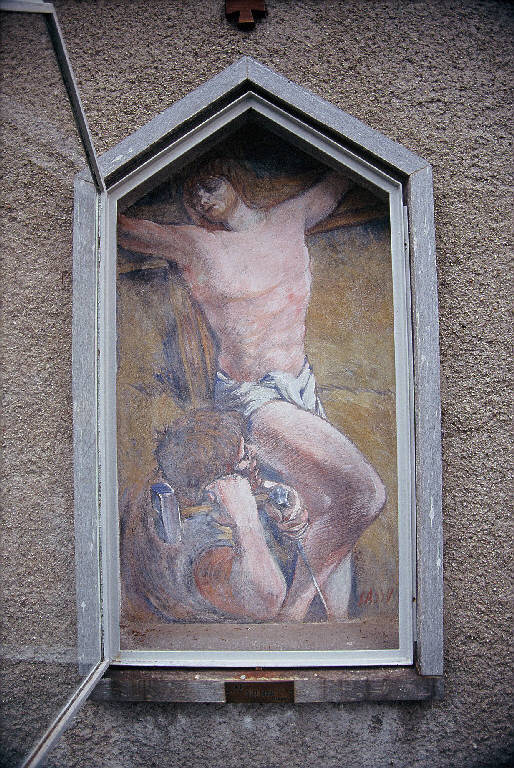 - NOTIZIE STORICO CRITICHE L'opera è dominata dalla monumentale figura del Cristo posta longitudinalmente nello spazio; in primo piano, in basso a sinistra, appare un soldato voltato di spalle, che regge il martello nell'atto di inchiodare il Salvatore alla croce.