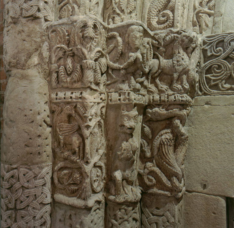 Capitello a doppia fascia divisa da una banda scolpita. L'ordine inferiore e quello superiore sono scolpiti con figurazioni fantastiche.