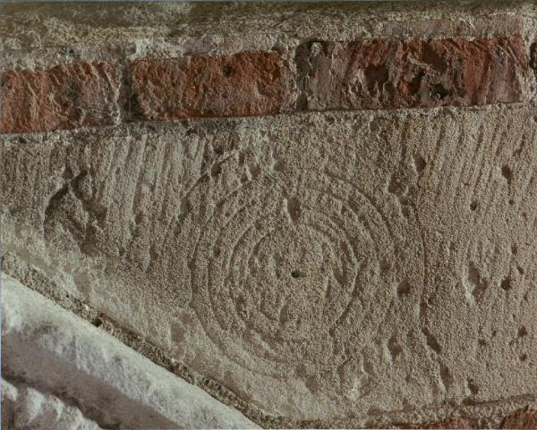 Concio scolpito a cerchi concentrici e con il centro segnato evidenti segni di gradina.