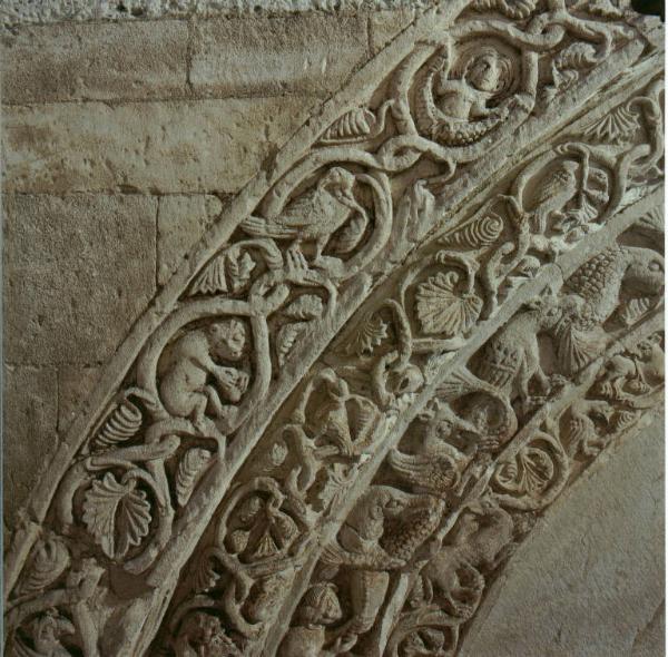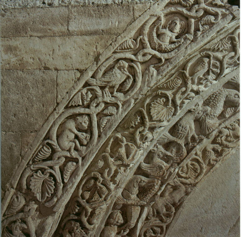 Prima ghiera della lunetta, scolpita a tralci abitati in un'alternanza di figure zoomorfe e antropomorfe.