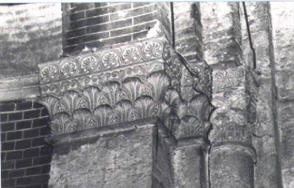 Semicapitello di semipilastro, corinzieggiante, a due file di foglie. La composizione è simile su ogni rilievo:sopra il rilievo liscio aggettante, due corone di identiche foglie d'acanto spinoso a palmetta sono disposte alternativamente in successione continua. Tra gli orli del fogliame si dispongono, nascenti da un medesimo stelo, i doppi nastri divaricati e spiraliformi.
