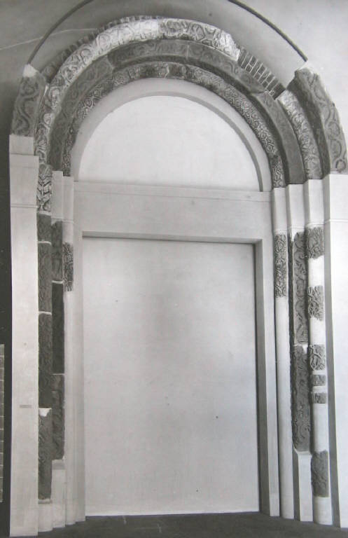 Portale con arco a tutto sesto a cinque ordini con lesene e cordonarure alternati scolpiti a rilievo con figurazioni.