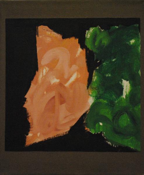 Su un fondo nero si distinguono una macchia di colore rosa affiancata angolarmente a una di colore verde, entrambe allusive ad ali di farfalla.
