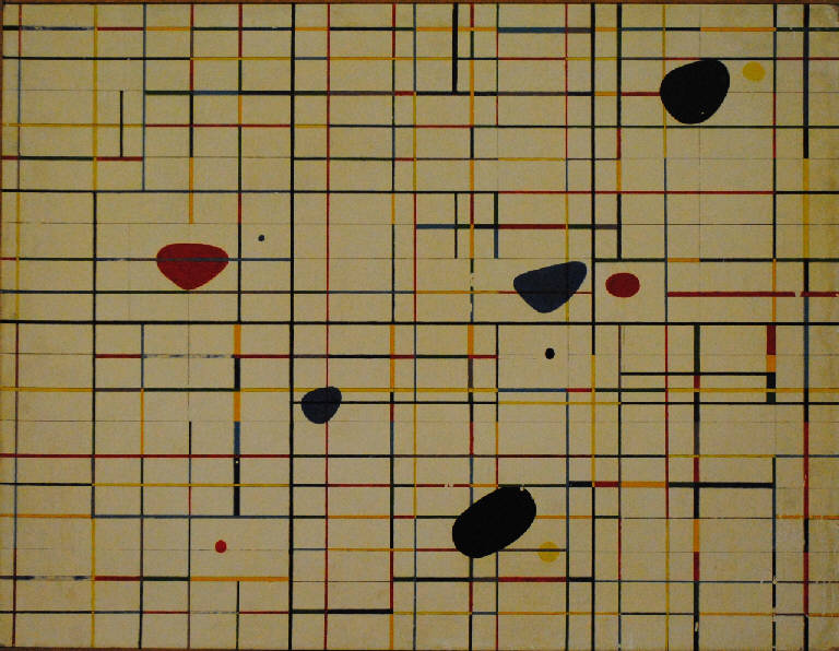 Composizione disciplinata da un reticolato di linee di colore blu, rosso e giallo su fondo bianco. Alcune macchie di colore blu, rosso e giallo, riconducibili ai "mobiles" di Alexander Calder, si dispongono senza un ordine apparente all'interno del reticolato.
