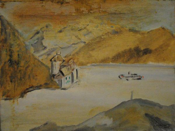 L'opera raffigura un paesaggio lacustre: sulla riva di un lago, chiuso da rilievi, si erge la struttura di un edificio, mentre in acqua si trova un battello.