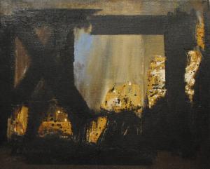 L'opera presenta un nastro adesivo nero che corre lungo il perimetro e funge da rudimentale cornice. Composizione d'invenzione con stralci di giornale applicati a collage nella parte inferiore della tela su cui sono presenti gocciolature di colore bianco, nero e azzurro; il resto della tela è occupato da larghe linee nere su fondo cromatico sfumato in marrone, azzurro e beige.