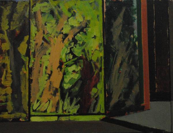 Composizione pittorica raffigurante gli elementi architettonici di una finestra oltre la quale è possibile vedere uno scorcio di giardino con piante (probabilmente i giardini di Villa Borghese a Roma) e la riflessione degli stessi sul vetro della finestra. L'opera è riconducibile alla sequenza delle finestre.