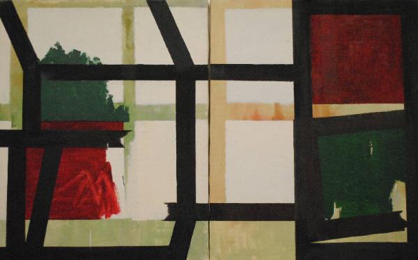 L'opera è composta da due tele di uguale misura pari a 100x80 cm. Sul telaio sono presenti due frecce, utili a posizionare le singole tele, e i numeri "1" e "2", indicanti la sequenzialità delle tele. Composizione d'invenzione articolata bidimensionalmente in due piani: quello di fondo è reso da una griglia di linee ortogonali pastello (verdi nella prima tela; aranciati nella seconda), quello di superficie da linee nere, ortogonali; sono presenti inserti di superfici campite in rosso e verde. L'opera è riconducibile alla sequenza pittorica dedicata alle finestre.