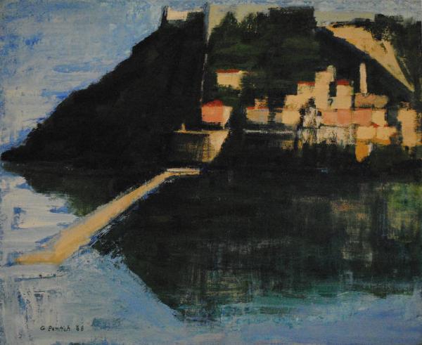Sul verso dell'opera è presente un rudimentale sistema per appendere il quadro costituito da un cordoncino fissato al telaio con due chiodini. L'opera raffigura uno scorcio di paesaggio marino, con caseggiati sulle pendici di un'altura, reso con una soluzione pittorica riconducibile allo stile di Nicolas de Staël.