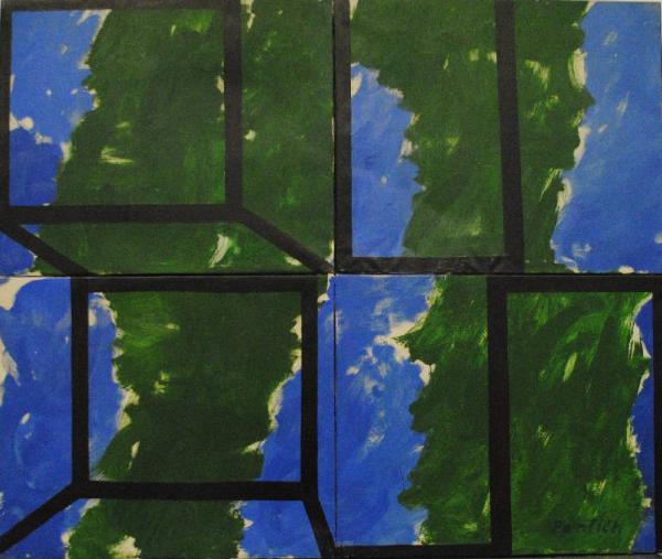 Il polittico è formato da quattro pannelli identici per dimensioni (50 x 60 cm) e tecnica pittorica. Le quattro tele che compongono il polittico sono tenute insieme, sul verso, da una struttura metallica (28 x 28 cm) a forma di croce, posta al centro, e da quattro placchette di metallo (1,5 x 10 cm) poste ai lati del polittico secondo una linea ideale che le ricongiunge alla croce metallica centrale. Intorno al perimetro dell'opera è presente un nastro adesivo nero che funge da rudimentale cornice. Composizione d'invenzione articolata in profili di figure quadrangolari su fondi cromatici azzurri e verdi.