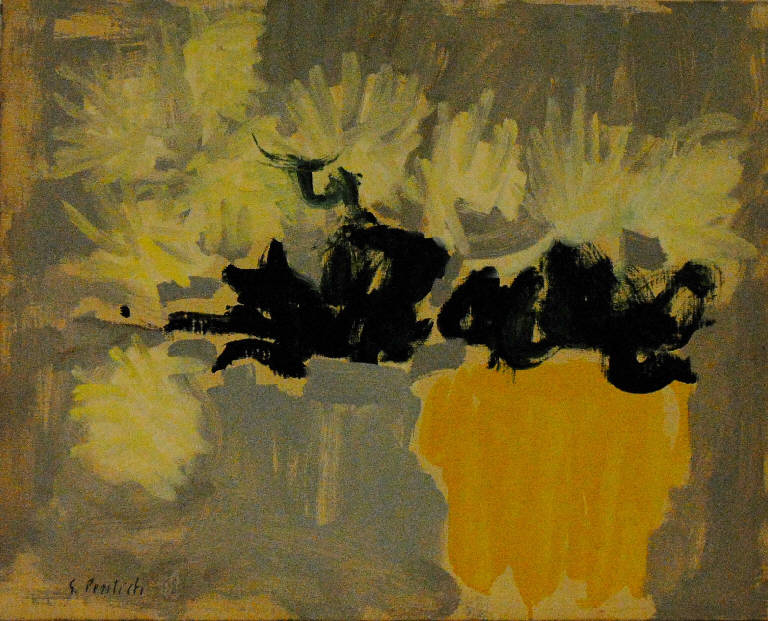 L'opera raffigura un vaso giallo contenente una pianta dai fiori bianchi, su fondo grigio.