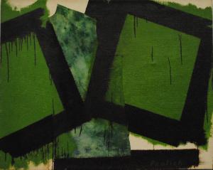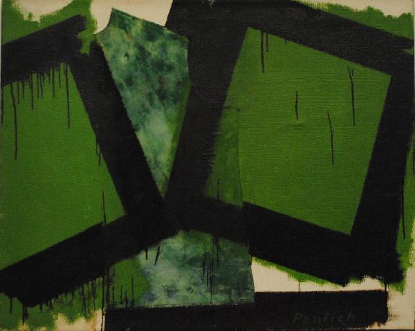 Intorno al perimetro dell'opera è presente un nastro adesivo nero che funge da rudimentale cornice. Composizione d'invenzione con inserto di tessuto verde articolata in due quadrati neri (a destra intero, a sinsitra parziale), su fondo verde, la cui struttura perimetrale nera sembra sfaldarsi in gocciolature di colore.